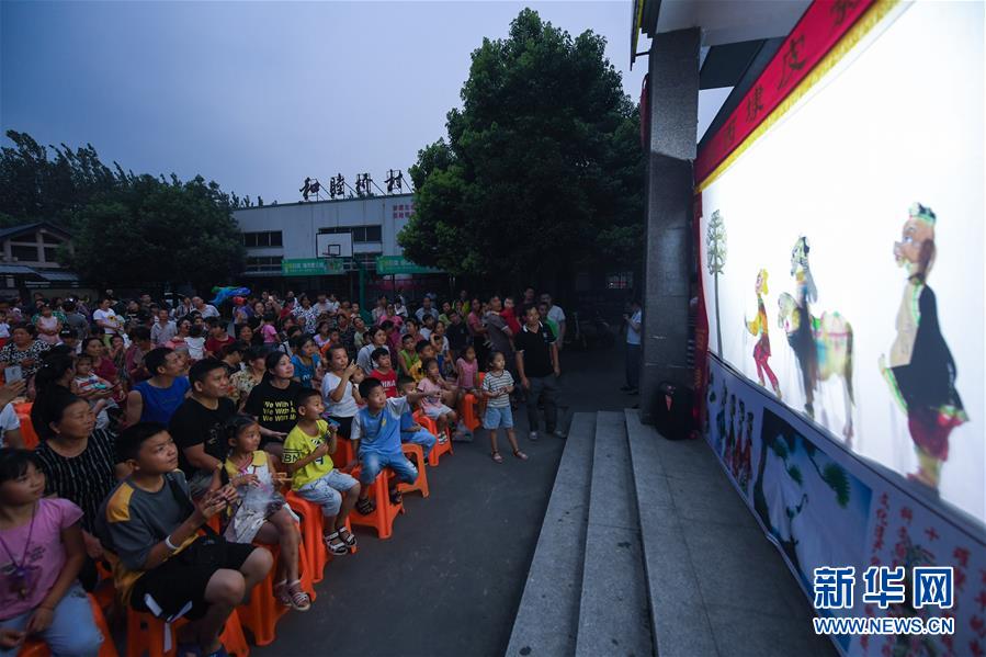 7月21日,和睦橋村的村民們?cè)谖幕Y堂觀看皮影戲表演《西游記》。新華社記者徐昱攝