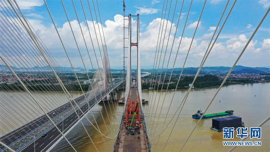 7月22日拍攝的廣州南沙港鐵路跨西江特大斜拉橋最后一組斜拉索吊裝現(xiàn)場(無人機照片)。新華社記者劉大偉攝