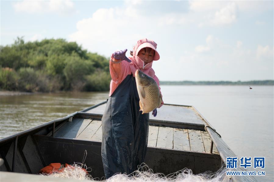 7月22日,在二道江灘地,赫哲族村民劉洪海的妻子叢秀松把剛打上來的魚放進(jìn)船艙。新華社記者王建威攝