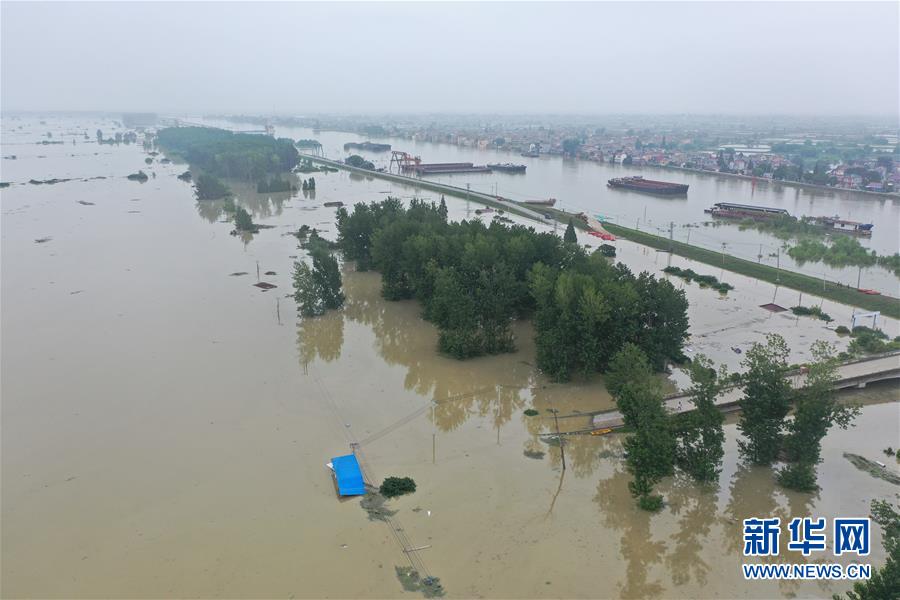 這是7月21日拍攝的被淹的南京市高淳區(qū)陽江鎮(zhèn)勝利圩(畫面左側(cè))(無人機照片)。新華社記者季春鵬攝