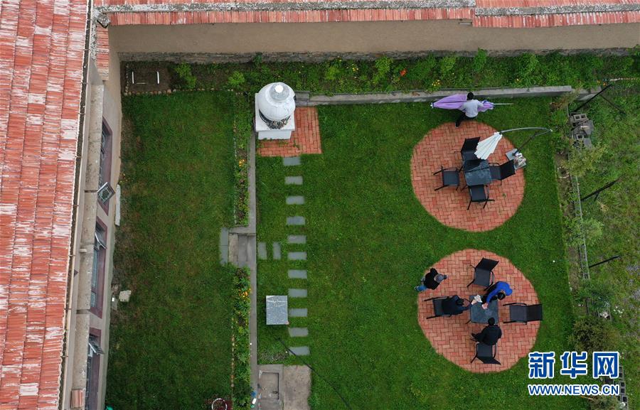 7月5日拍攝的阿壩縣查理鄉(xiāng)神座村客棧院落(無人機照片)。新華社記者陳天湖攝