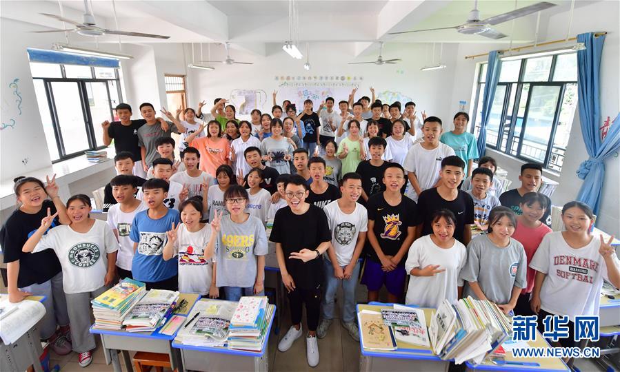 在融水苗族自治縣丹江中學(xué)1708班舉辦的送別班會上,支教老師溫昌浩(前排居中黑色衣服)和同學(xué)們合影(7月23日攝)。新華社記者黃孝邦攝