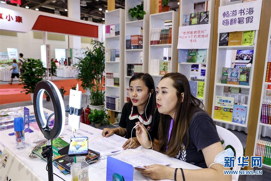 7月23日,兩位參展工作人員在網(wǎng)上直播介紹圖書。當(dāng)日,第十屆江蘇書展在江蘇蘇州開幕,400多家出版發(fā)行單位參展,吸引眾多讀者選購圖書。新華社記者楊磊攝