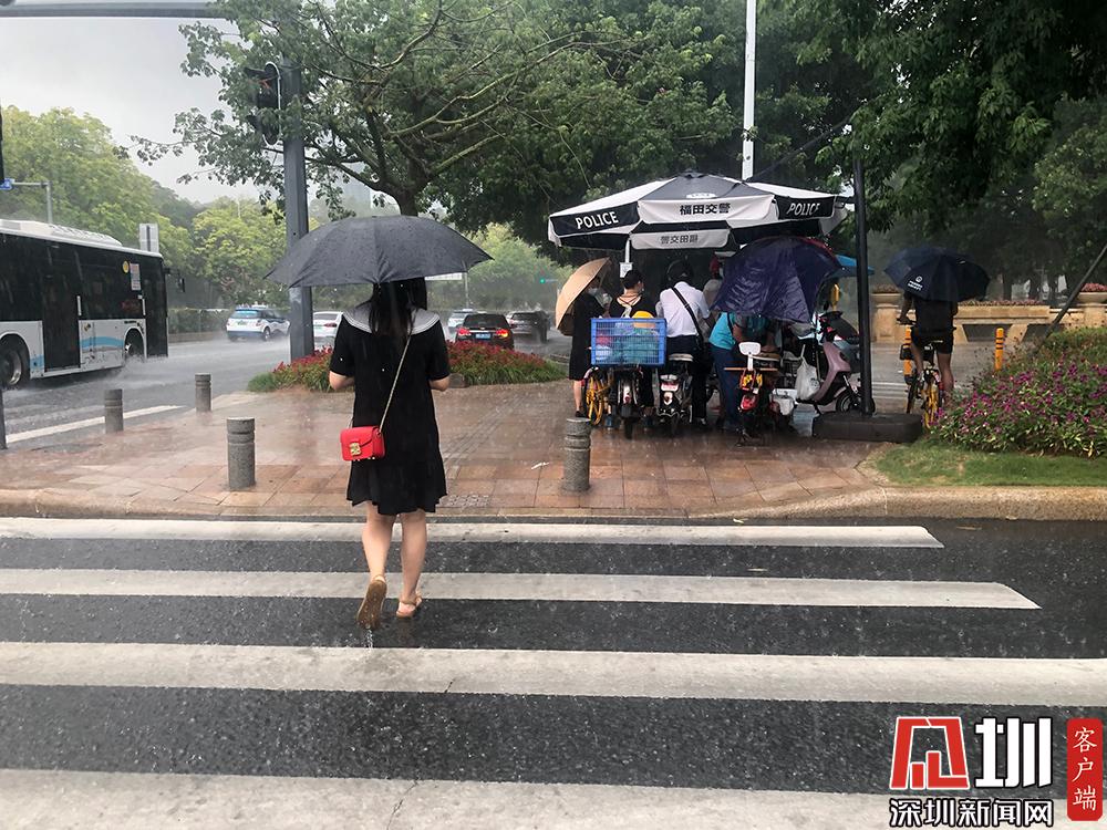 雨勢(shì)較大,市民紛紛躲在交警執(zhí)勤使用的雨傘下避雨。