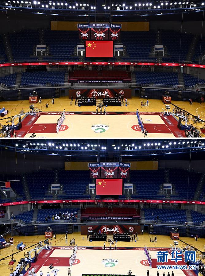 拼版照片的上圖為7月26日遼寧本鋼隊(duì)對(duì)陣四川五糧金樽隊(duì)的比賽現(xiàn)場(chǎng);下圖為7月26日上海久事隊(duì)對(duì)陣山東西王隊(duì)的比賽現(xiàn)場(chǎng),該場(chǎng)比賽首次恢復(fù)觀眾現(xiàn)場(chǎng)觀看比賽。當(dāng)日,在山東青島舉行的2019-2020賽季中國(guó)男子籃球職業(yè)聯(lián)賽(CBA)復(fù)賽第二階段(嶗山賽區(qū))比賽中,醫(yī)護(hù)人員、教師、公安戰(zhàn)線人士通過(guò)官方購(gòu)票平臺(tái),完成包括核酸檢測(cè)在內(nèi)的相關(guān)流程后進(jìn)場(chǎng)觀看了上海久事隊(duì)迎戰(zhàn)山東西王隊(duì)的比賽。觀賽期間,觀賽者須全程佩戴口罩,對(duì)號(hào)入座,嚴(yán)格保持間隔一米就座。退場(chǎng)時(shí),觀眾須按照自后向前、先兩邊后中間的順序,保持“一米線”社交距離有序退場(chǎng)。新華社記者 郭緒雷 攝