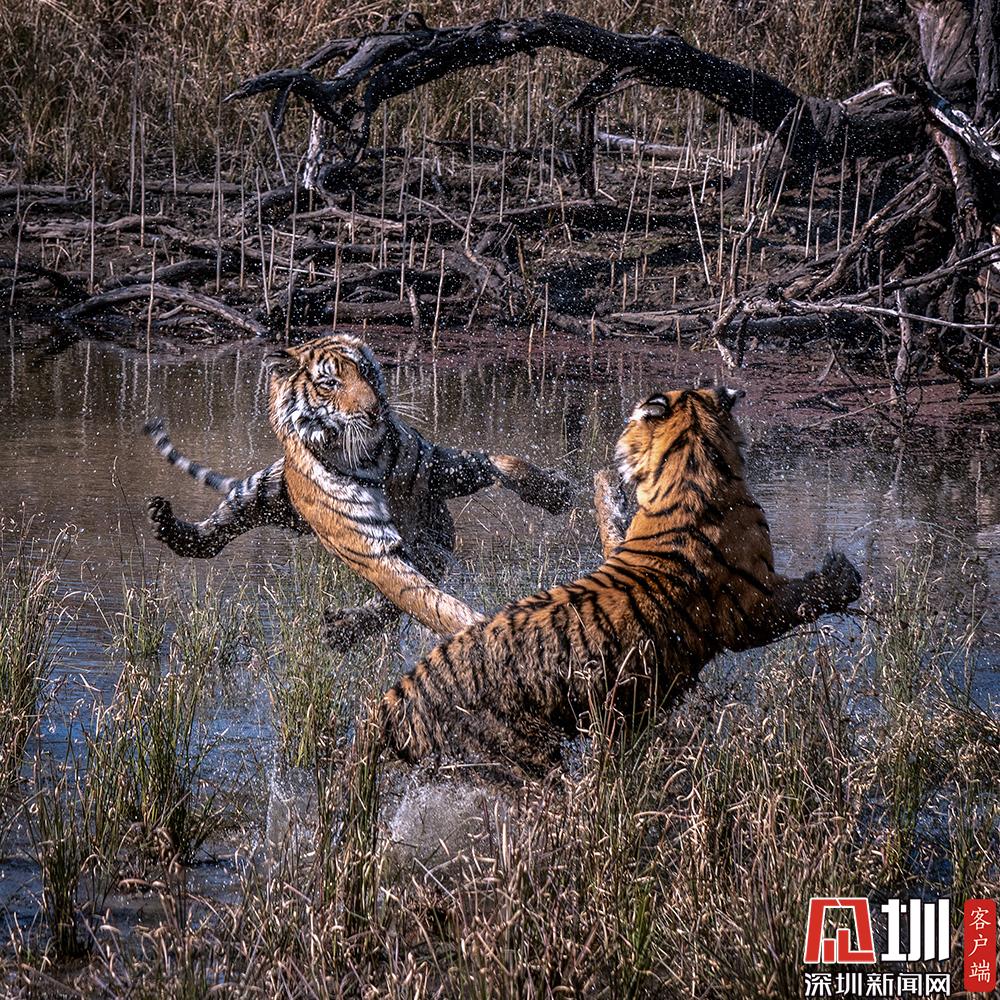 2020年7月27日,兩只老虎幼崽激烈的水上爭奪戰(zhàn)。