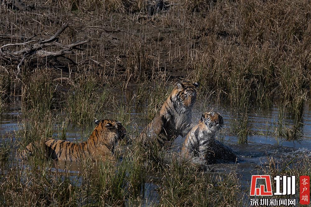 2020年7月27日,兩只老虎幼崽激烈的水上爭奪戰(zhàn)。