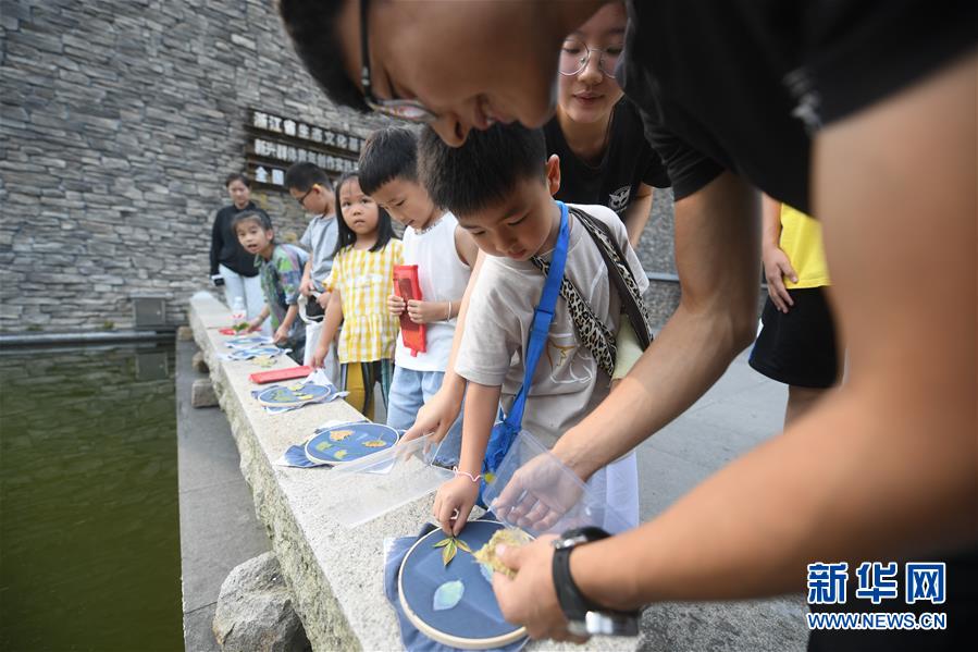 7月27日,小朋友們用樹葉制作藍(lán)染。新華社記者 翁忻旸 攝