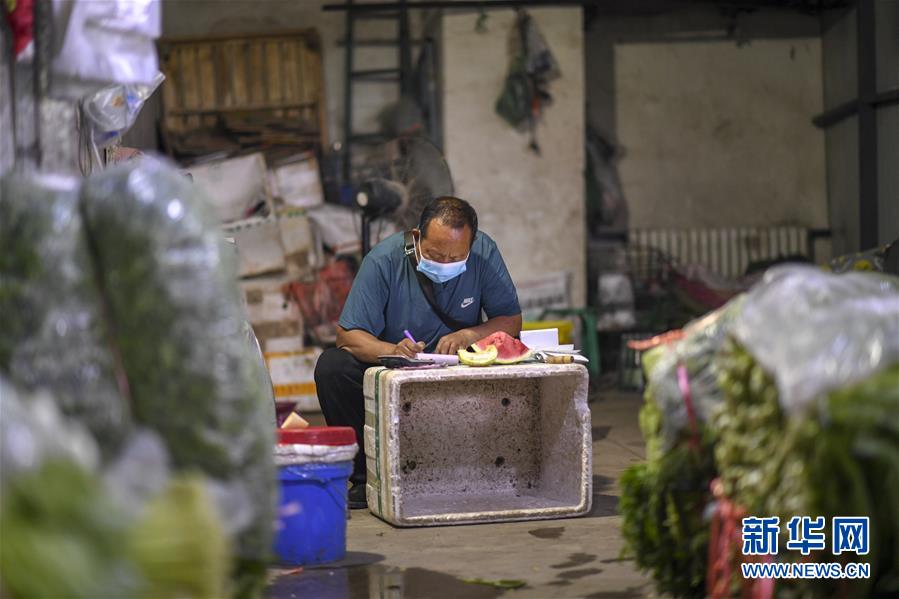 7月26日,在烏魯木齊新聯(lián)農(nóng)副產(chǎn)品綜合市場(chǎng)內(nèi),商販在計(jì)算一天的收入。新華社記者 趙戈 攝