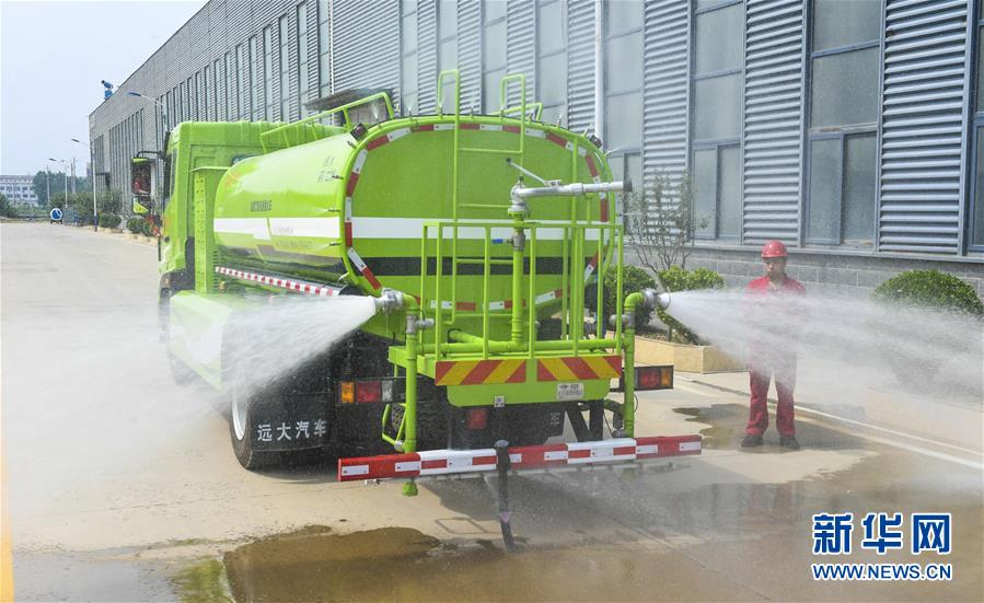 7月27日,河北景縣開發(fā)區(qū)一家新能源汽車制造公司工人在對增程式新能源灑水車進行性能校驗。新華社記者 李曉果 攝