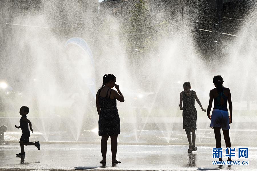 7月28日,在奧地利維也納,兒童在一處廣場戲水。新華社記者郭晨攝