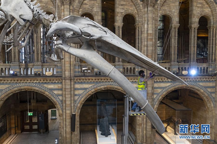 7月27日,工作人員在英國倫敦的自然歷史博物館大廳內(nèi)清潔一具藍(lán)鯨骨架。受新冠疫情影響關(guān)閉數(shù)月的英國自然歷史博物館將于8月5日重新對外開放,目前館方正在為重新開放做最后準(zhǔn)備。參觀者需要提前預(yù)約參觀時段、全程佩戴口罩且保持安全距離。新華社記者韓巖攝