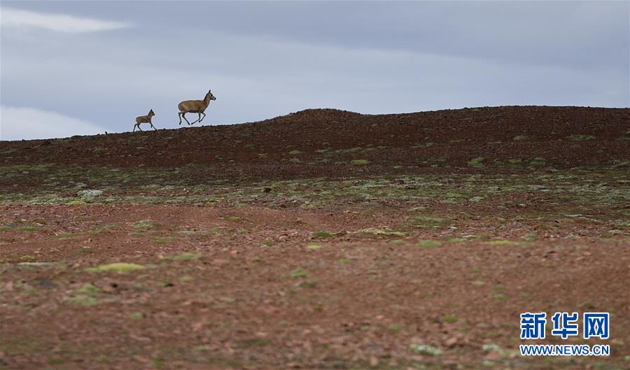 這是7月7日在可可西里卓乃湖區(qū)域拍攝的兩只藏羚羊。新華社記者張龍攝