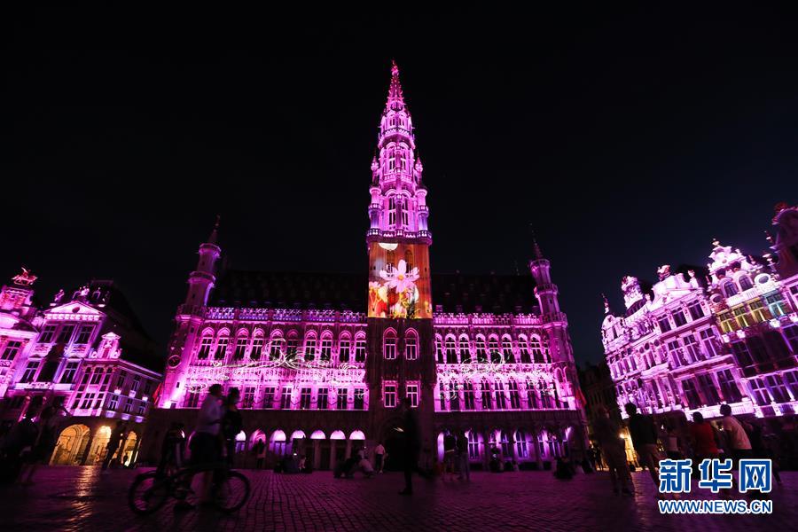 7月29日,人們?cè)诒壤麜r(shí)布魯塞爾大廣場(chǎng)欣賞聲光秀,市政廳外墻上投射出“鮮花時(shí)光”的字樣。7月29日,比利時(shí)布魯塞爾大廣場(chǎng)舉行大型聲光秀。藝術(shù)家在市政廳等歷史建筑上投影文字和圖案,紀(jì)念這個(gè)夏天受新冠疫情影響而不能如期舉辦的文化活動(dòng)。新華社記者鄭煥松攝
