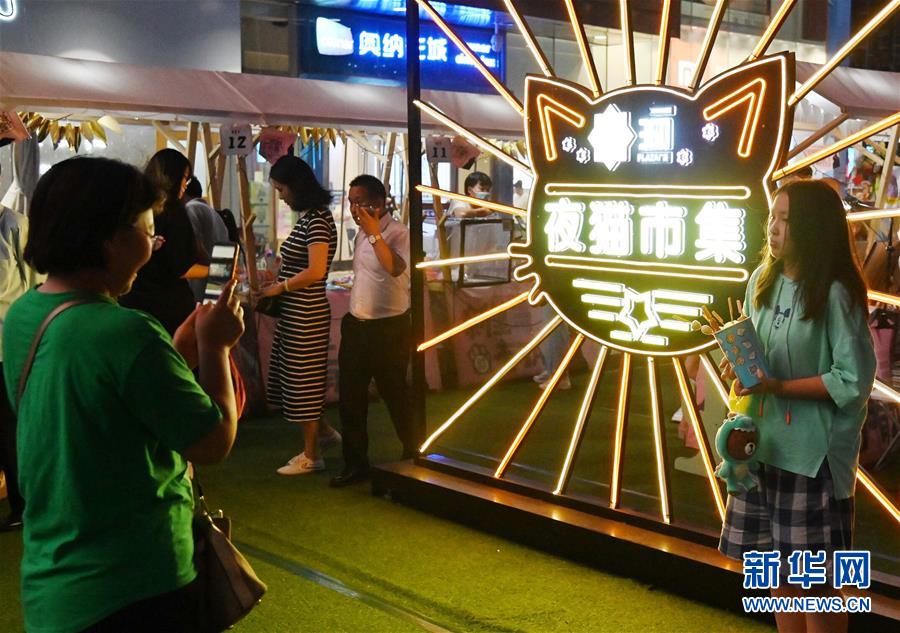 在“夜貓市集”入口處,人們在拍照留念(7月29日攝)。