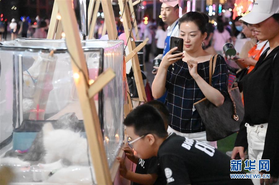 市民在“夜貓市集”上觀看寵物貓(7月29日攝)。新華社記者張浩然攝