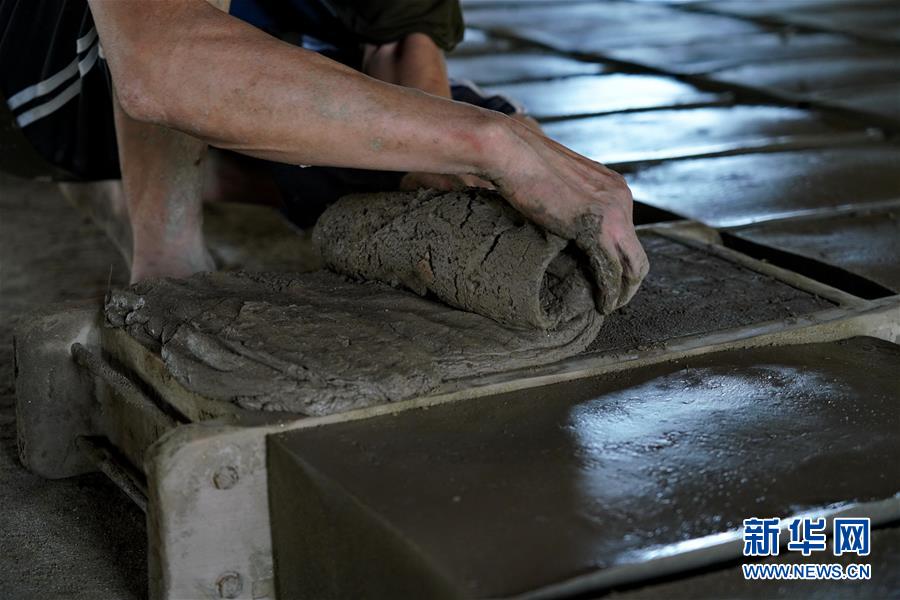 7月30日,河北省任丘市出岸鎮(zhèn)古建磚廠工人在制作磚坯。新華社記者牟宇攝