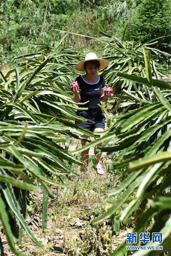 8月3日,在碗米坡鎮(zhèn)首八峒村,種植基地負責人易潤菊采摘成熟的火龍果。