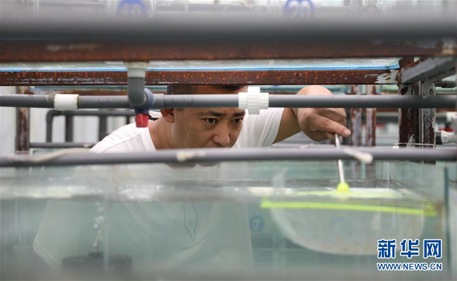8月4日,張忠堡村村民趙世龍在觀察育種筐里的觀賞魚排卵狀況。新華社記者姚劍鋒攝