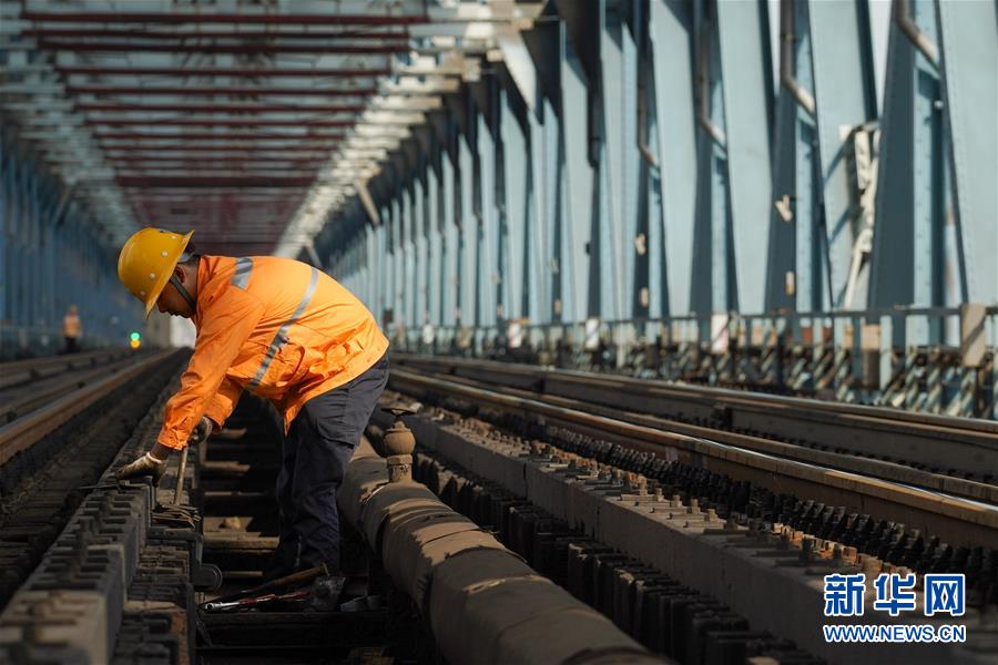 8月6日,一位橋隧工在南京長江大橋作業(yè)點(diǎn)拆螺桿。新華社記者李博攝