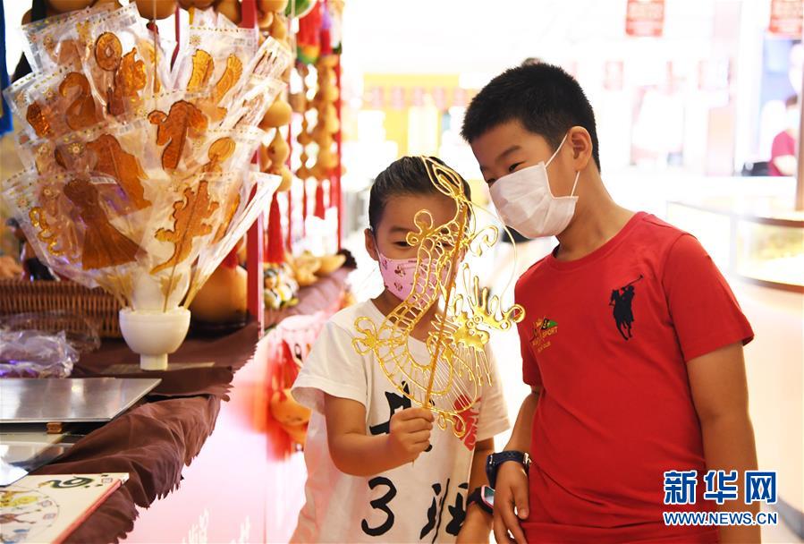 8月8日,兩名小朋友在第十八屆中關(guān)村國際美食節(jié)美食美酒嘉年華文創(chuàng)非遺展示區(qū)感受糖畫魅力。