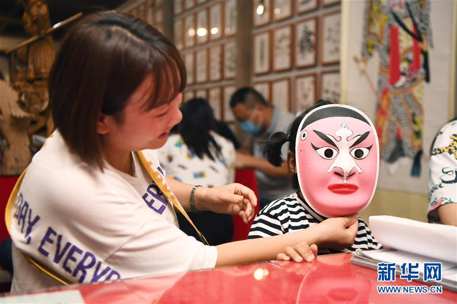 8月8日,小朋友在長(zhǎng)沙市非物質(zhì)文化遺產(chǎn)展示館試戴湘劇臉譜。新華社記者 薛宇舸 攝