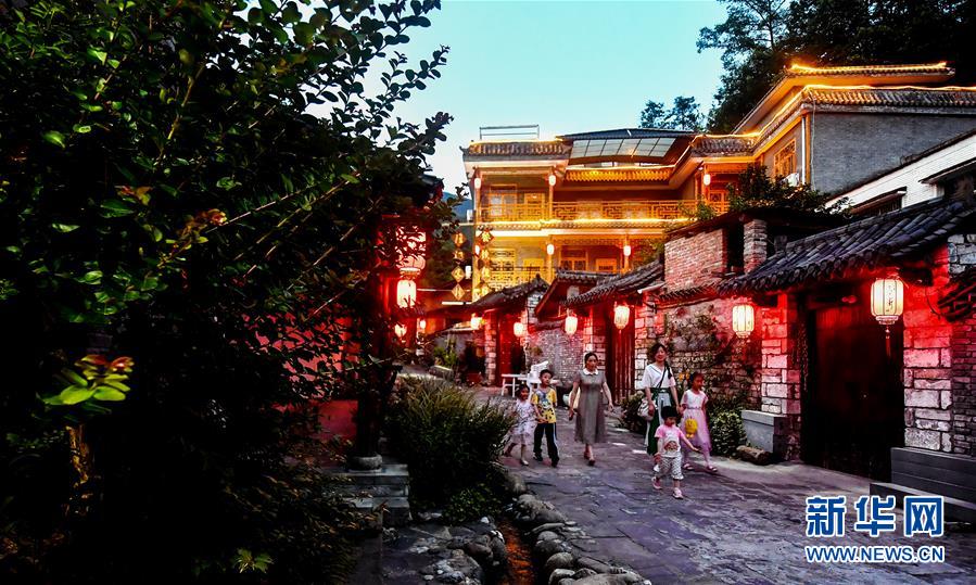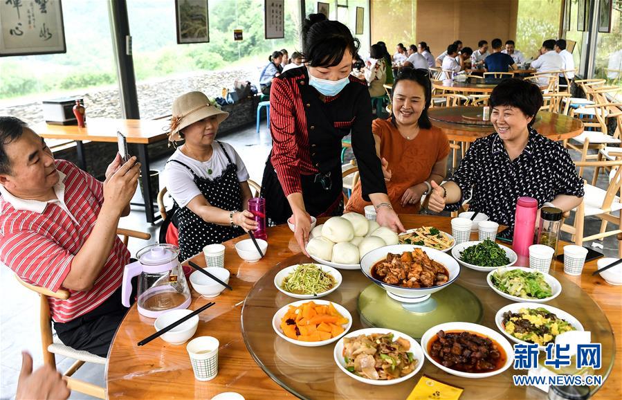 游客在陜西寶雞市太白縣咀頭鎮(zhèn)白云村的一家農(nóng)家樂里就餐(7月5日攝)。白云村是秦嶺深處的小山村,2016年建檔立卡貧困戶303人。近年來,為了徹底改變貧困面貌,白云村依靠當?shù)匾郎桨牡赜騼?yōu)勢,全面提升人居環(huán)境和村容村貌,發(fā)展鄉(xiāng)村旅游,讓群眾持續(xù)增收。目前,白云村已實現(xiàn)整體脫貧,2019年全村人均純收入12880元。新華社記者劉瀟攝。