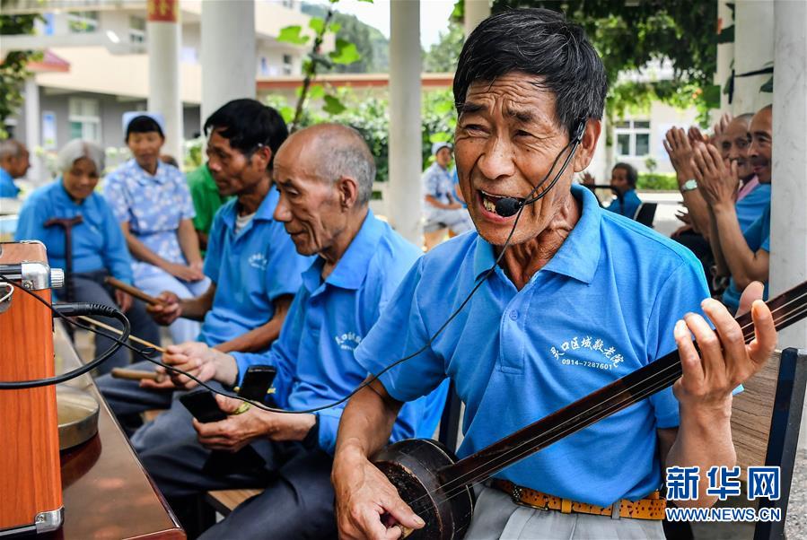 陜西商洛市洛南縣靈口區(qū)域敬老院的老人們在唱靜板書(7月28日攝)。據(jù)了解,陜西洛南縣目前共有9所敬老院,設(shè)置床位760張,對全縣愿意到敬老院的381名農(nóng)村特困人員實行集中供養(yǎng)政策。新華社記者劉瀟攝。