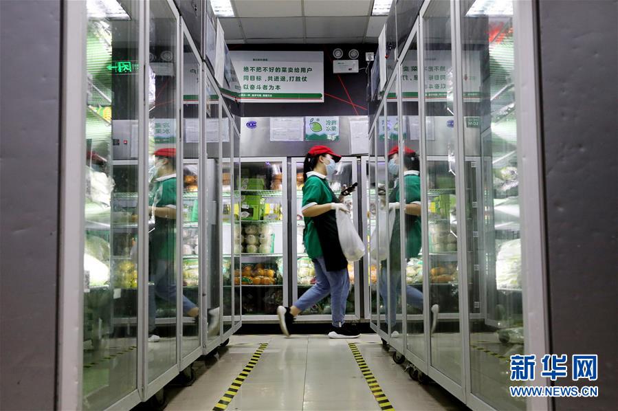工作人員在叮咚買菜一家前置倉內為網(wǎng)絡訂單配貨(7月17日攝)。近年來,在上海崛起了一批以盒馬、叮咚、拼多多為代表的在線經(jīng)濟新力量,在助力脫貧攻堅、提升城市居民品質生活方面發(fā)揮著重要作用。電商加持下的“云農(nóng)業(yè)”加速發(fā)展,一端為市民提供更便宜新鮮的農(nóng)產(chǎn)品,另一端讓山區(qū)的優(yōu)質產(chǎn)品加速進入城市餐桌,化解交通不便、農(nóng)產(chǎn)品滯銷等問題。新華社記者方喆攝。