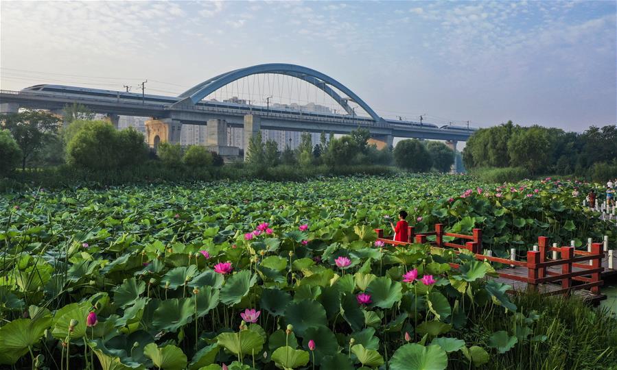 市民在唐山市豐南區(qū)人民公園欣賞荷花(7月25日攝,無(wú)人機(jī)照片)。近年來(lái),河北省唐山市豐南區(qū)全力推動(dòng)“全域治水、清水潤(rùn)城”工程,形成了以唐津運(yùn)河、人民公園生態(tài)廊道等以健身、休閑、旅游功能于一體的人水相親、城水相依的景觀環(huán)境,為綠色發(fā)展注入活力。新華社記者楊世堯攝。