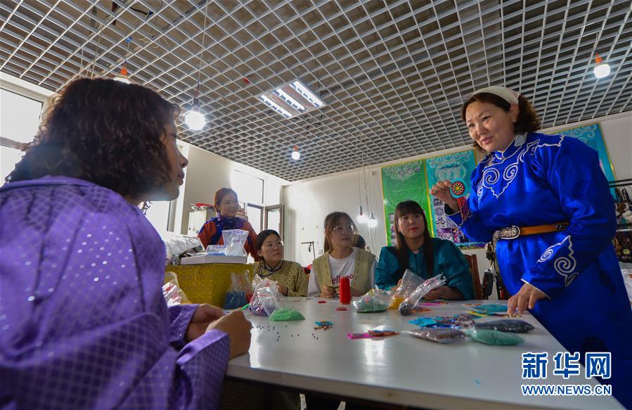 烏仁(右一)在內(nèi)蒙古自治區(qū)鄂溫克族自治旗巴彥托海鎮(zhèn)太陽花傳承發(fā)展中心的制作車間與手工藝人交流(8月6日攝)。新華社記者徐欽攝。