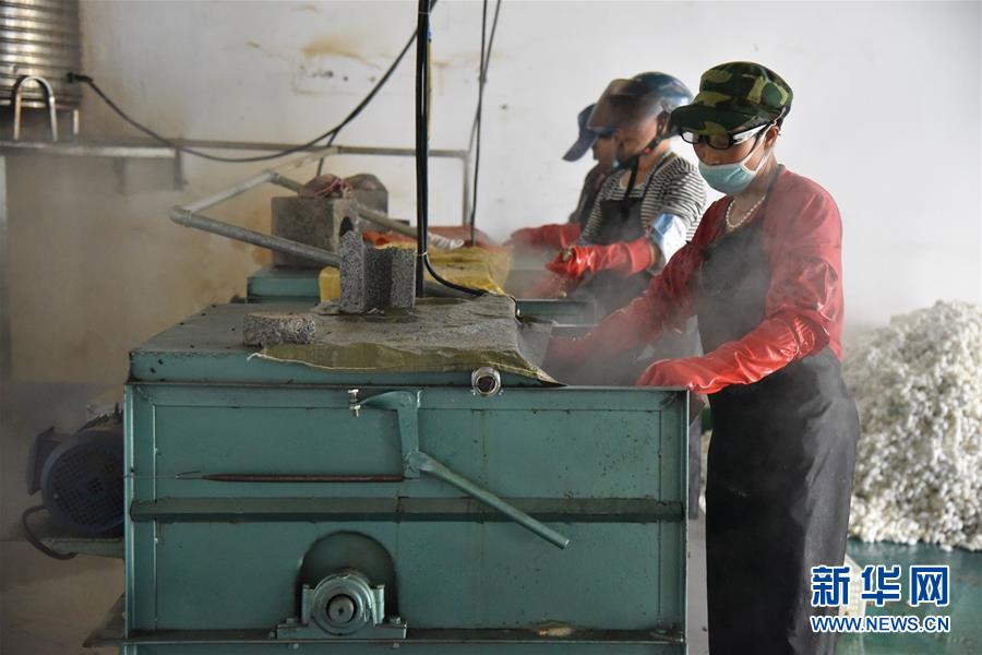 在貴州省畢節(jié)市納雍縣勺窩鎮(zhèn),納雍縣瑞慧桑蠶養(yǎng)殖發(fā)展有限責(zé)任公司工作人員在蒸煮蠶繭(7月21日攝)。新華社記者駱飛攝。