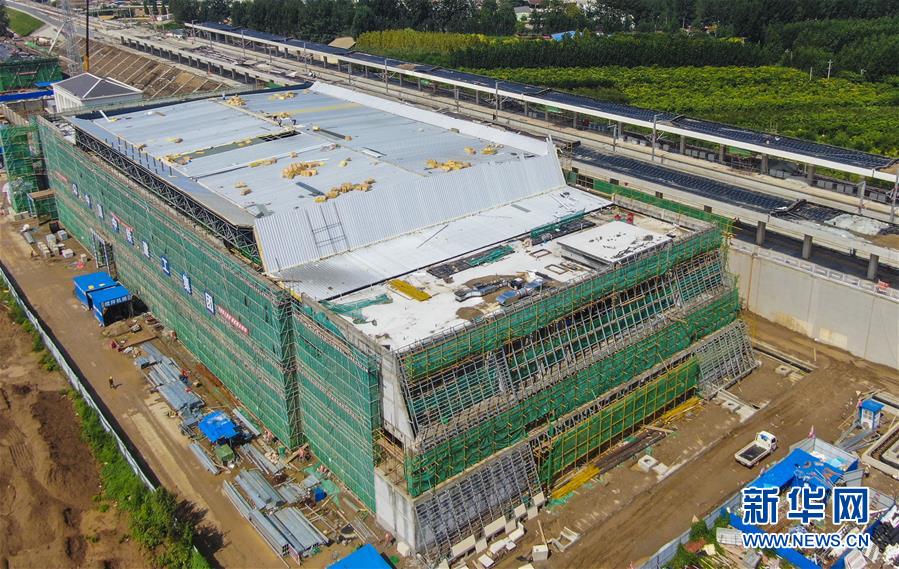 8月10日拍攝的建設中的京雄城際鐵路霸州北站(無人機照片)。京雄城際鐵路霸州北站站臺雨棚混凝土結構施工日前全部完成,目前霸州北站已全面轉入裝飾裝修和機電安裝階段,預計2020年底投入使用。京雄城際鐵路是連接北京市區(qū)、大興機場和雄安新區(qū)的重要干線。建成后,將進一步完善京津冀區(qū)域高速鐵路網(wǎng)結構,便利沿線群眾出行,對于推動京津冀協(xié)同發(fā)展和支撐建設雄安新區(qū)具有重要意義。新華社記者李曉果攝。