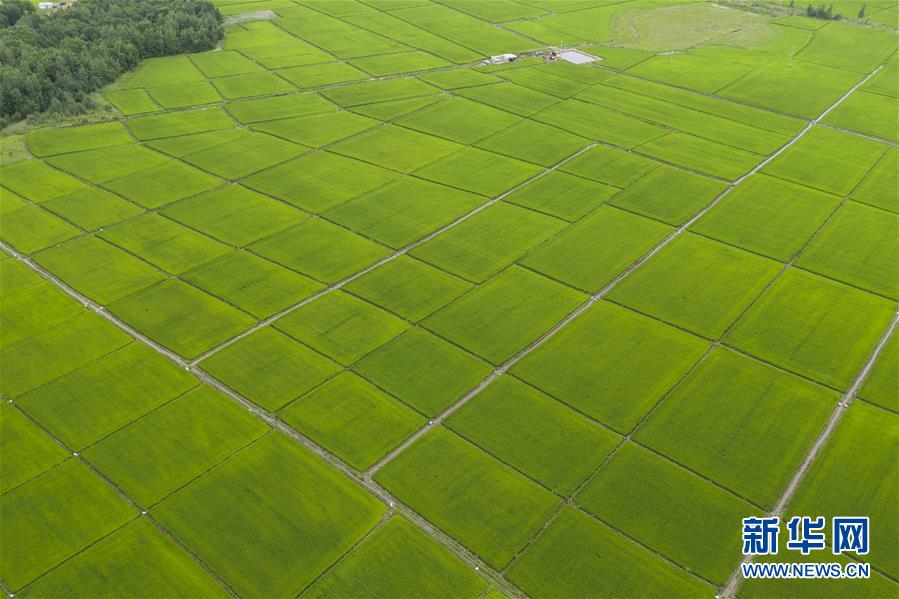 8月11日在撫遠(yuǎn)市拍攝的稻田(無人機(jī)照片)。時(shí)下,“華夏東極”黑龍江省撫遠(yuǎn)市的水稻長(zhǎng)勢(shì)良好,蒼翠的稻田一望無際,猶如綠毯鋪在大地上。新華社記者謝劍飛攝。