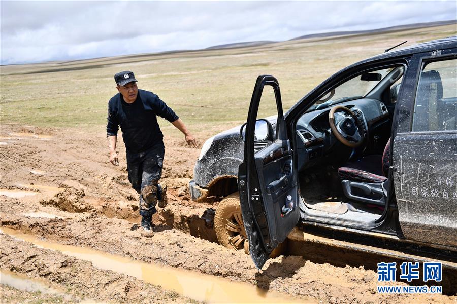 7月6日,卓乃湖保護(hù)站站長秋培扎西查看陷車情況。新華社記者張龍攝