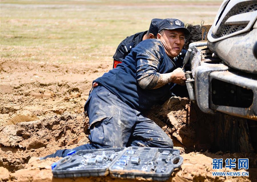 7月6日,卓乃湖保護(hù)站站長秋培扎西在可可西里地區(qū)修理車輛。新華社記者薛玉斌攝