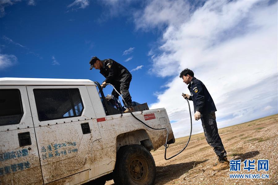 7月6日,巡山隊(duì)員更松多杰(左)和白瑪東周在可可西里地區(qū)為車輛加油。新華社記者張龍攝