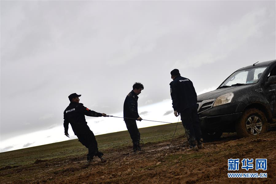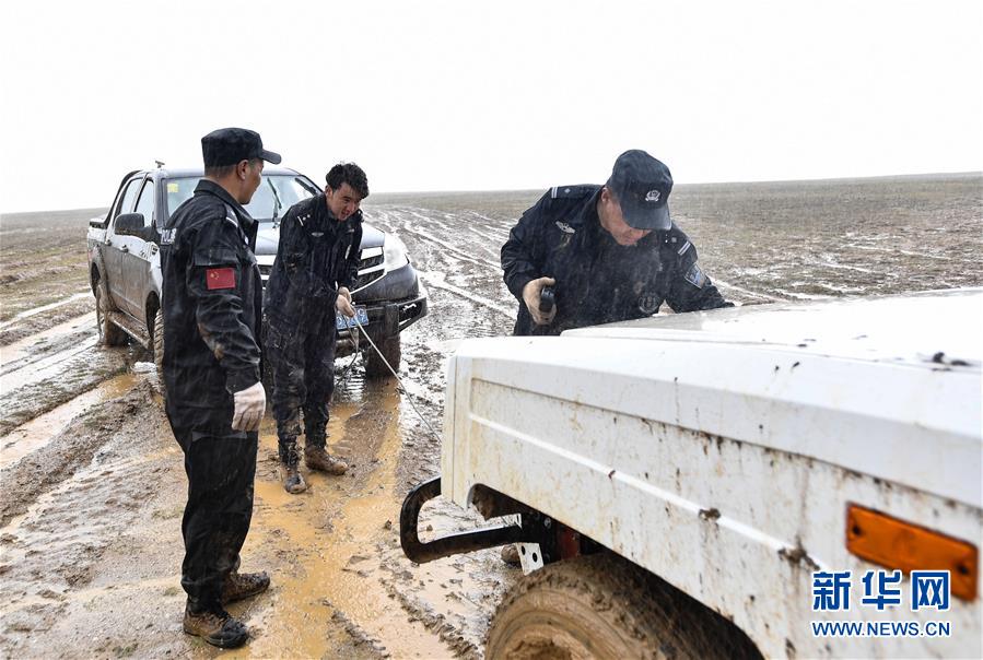 7月6日,卓乃湖保護(hù)站站長秋培扎西(右)和巡山隊(duì)員更松多杰(左)、白瑪東周在可可西里地區(qū)冒雨拉車。新華社記者張龍攝