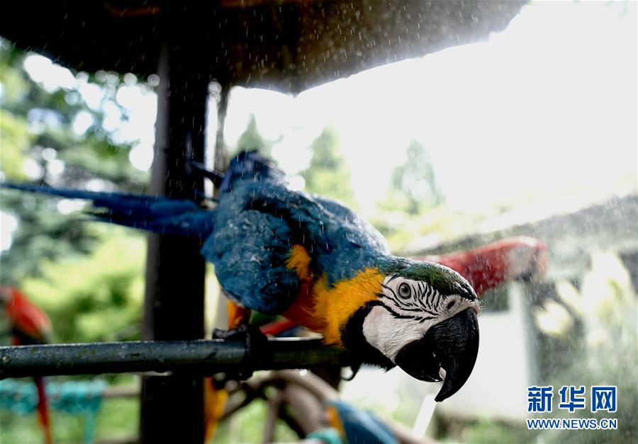 8月11日,上海動(dòng)物園的金剛鸚鵡在享受?chē)娏芙禍?。?dāng)日,上海最高溫度達(dá)到35攝氏度,上海動(dòng)物園開(kāi)啟園內(nèi)安裝的各種噴淋裝置,讓動(dòng)物們防暑降溫,樂(lè)享清涼。新華社記者張建松攝