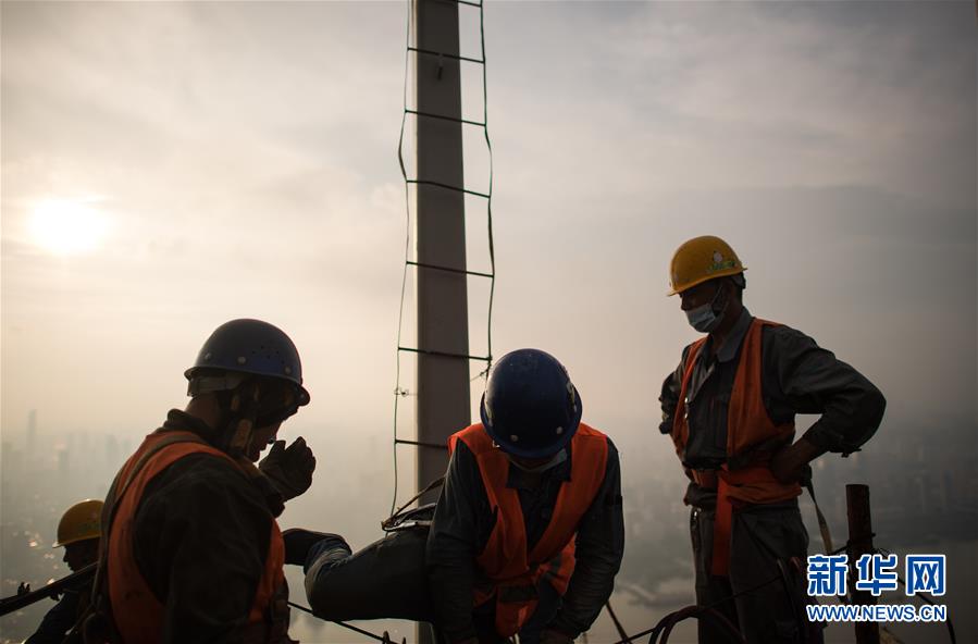 8月11日,工人在武漢綠地中心項(xiàng)目建設(shè)現(xiàn)場近500米的高空施工。新華社記者肖藝九攝