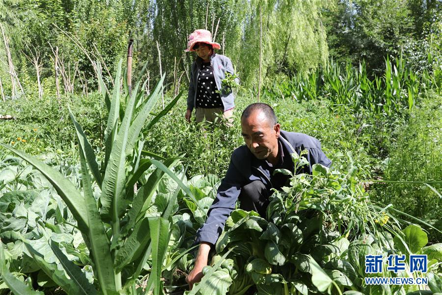 甘肅省金昌市永昌縣下四壩村村民徐文國和妻子在自家的菜園里采摘蔬菜(7月10日攝)。新華社記者 杜哲宇 攝