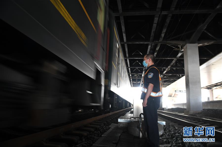 8月12日,長春火車站客運車間上水工韓冰等候列車停站。新華社記者 林宏 攝