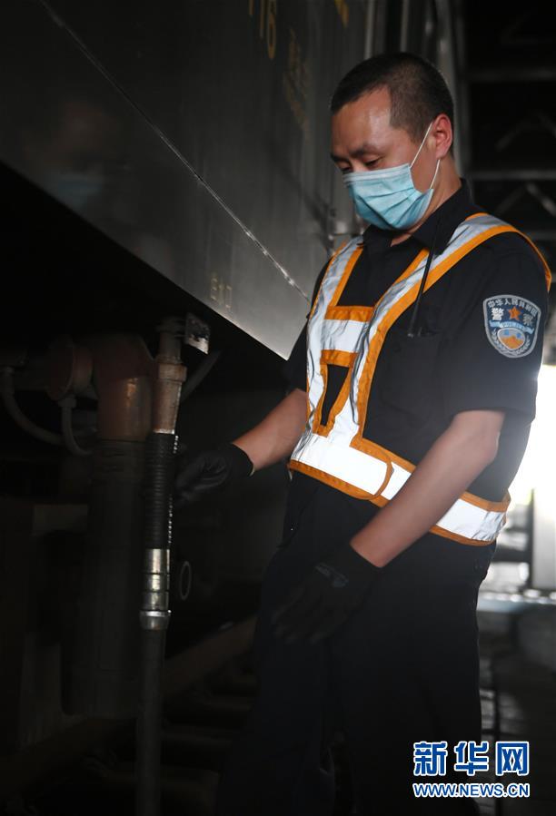 8月12日,長春火車站客運車間上水工韓冰在給列車上水。新華社記者 林宏 攝