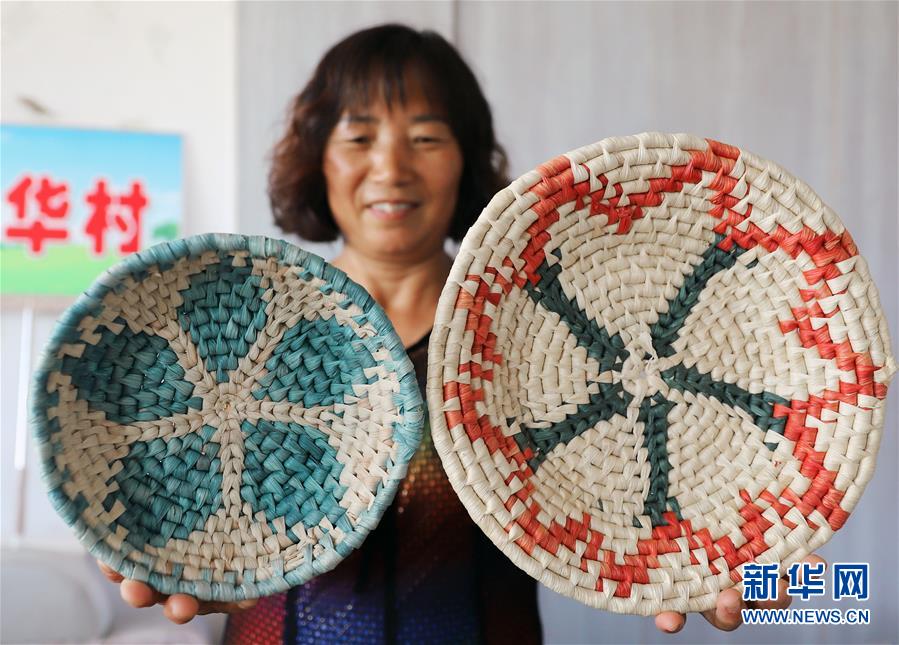 8月12日,一名村民在展示草編工藝品。新華社記者 雒圓 攝