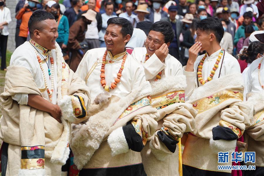 8月12日,演員在開(kāi)幕式上表演舞蹈。當(dāng)日,2020中國(guó)碌曲鍋莊舞展演暨甘南藏族自治州第六屆少數(shù)民族傳統(tǒng)體育運(yùn)動(dòng)會(huì)在甘肅省甘南州碌曲縣夏澤灘草原上舉行。開(kāi)幕式上,三千余名身著節(jié)日盛裝的演員和當(dāng)?shù)厝罕娫诓菰掀鹞瑁旰蟪跚绲牟菰铣錆M歡聲笑語(yǔ)。新華社記者 耿馨寧 攝