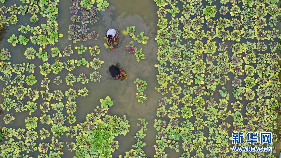 8月12日,河北省灤州市茨榆坨鎮(zhèn)草塘坨村花農(nóng)在大棚內(nèi)打理種植的蓮花(無人機照片)。新華社記者 牟宇 攝