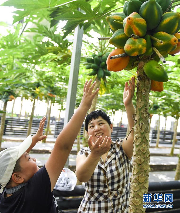 在吉林省永吉縣萬昌鎮(zhèn)宇豐紅果木瓜產(chǎn)業(yè)園,游客在大棚內(nèi)體驗木瓜采摘(8月12日攝)。近年來,吉林省永吉縣萬昌鎮(zhèn)積極優(yōu)化農(nóng)業(yè)產(chǎn)業(yè)結(jié)構(gòu),推進農(nóng)業(yè)生態(tài)觀光采摘園建設,引進木瓜、香蕉等熱帶果品發(fā)展“南果北種”,助當?shù)剞r(nóng)民開啟一條致富新路。新華社記者 許暢 攝