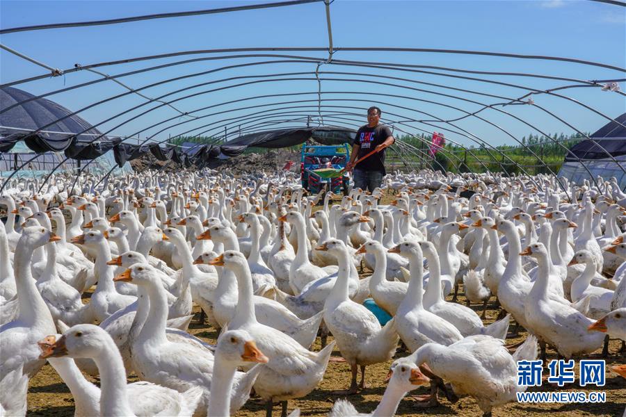 8月12日,在鎮(zhèn)賚縣黑魚泡鎮(zhèn)岔臺村,村民王木堯在投喂鵝飼料。
