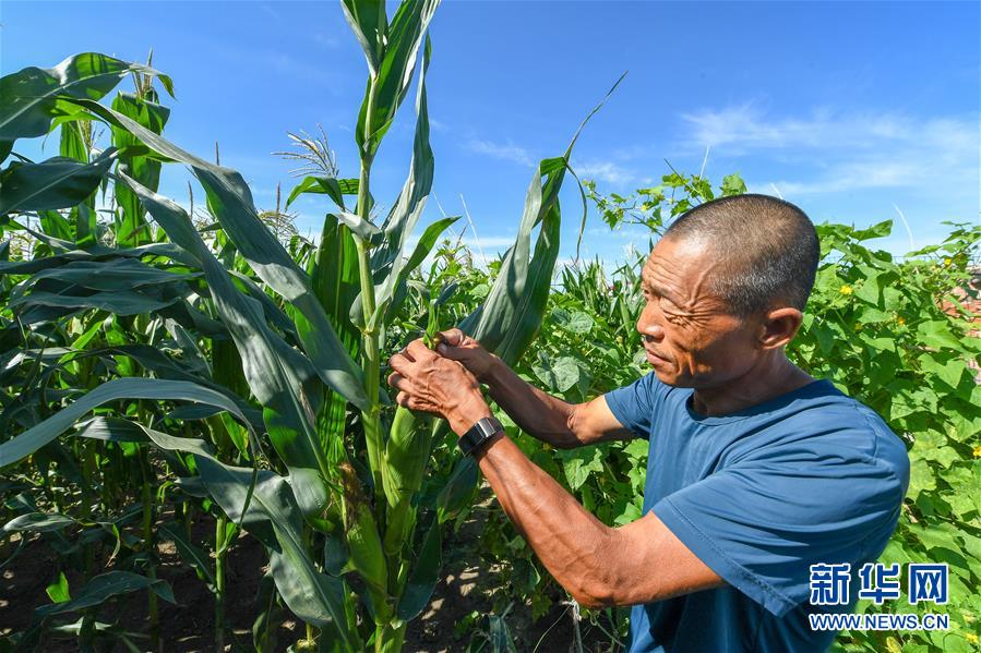 8月12日,在鎮(zhèn)賚縣黑魚泡鎮(zhèn)岔臺(tái)村,村民曲海波查看玉米長(zhǎng)勢(shì)。新華社記者 張楠 攝