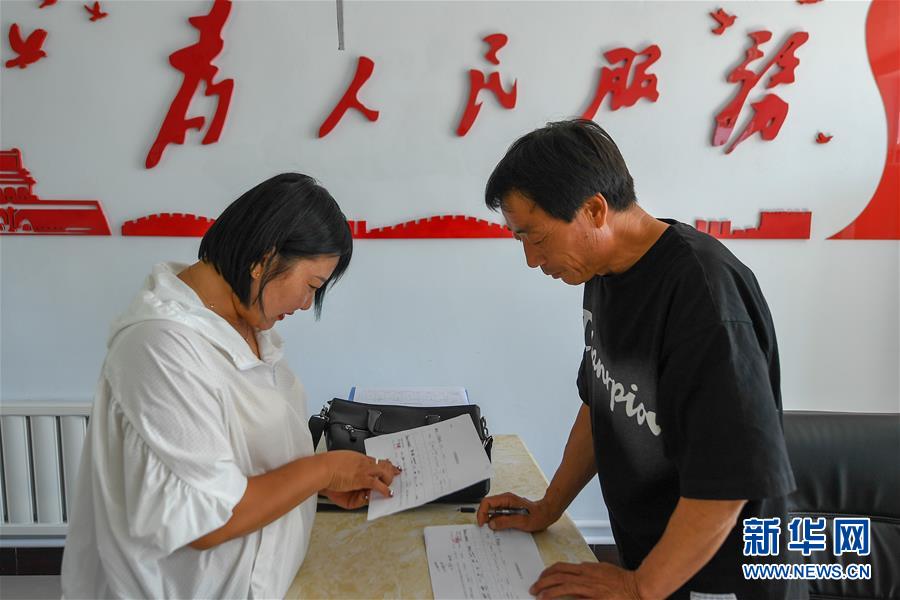 8月12日,在鎮(zhèn)賚縣黑魚泡鎮(zhèn)岔臺(tái)村,村民包春苗(左)在便民服務(wù)大廳辦業(yè)務(wù)。新華社記者 張楠 攝